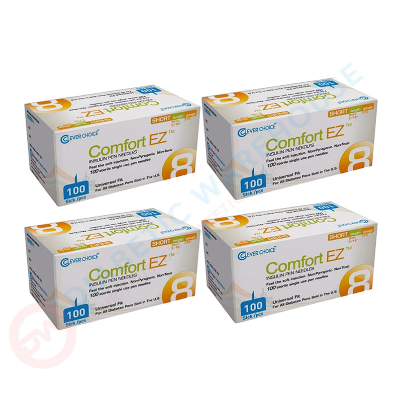 The Clever Choice Comfort EZ Insulin Pen Needles provide maximum comfort and precision for accurate readings. 31G and 8mm in size, the beveled, lubricated needles provide a smoother, more comfortable injection experience. 100 pen needles per box, pack of 4 boxes.