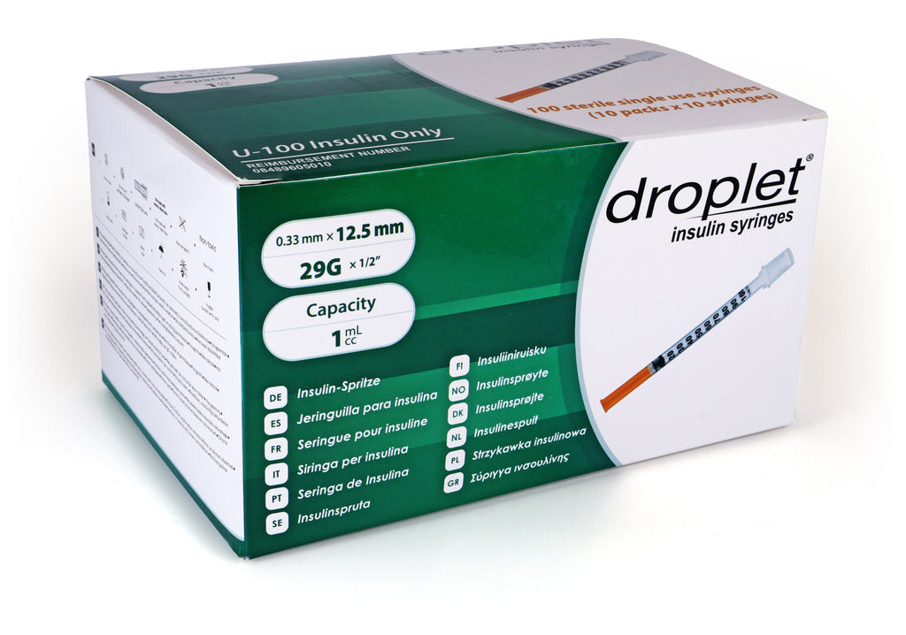 100 Droplet Insulin Syringes - 29G 1cc 1/2" (12.5mm) 100/bx