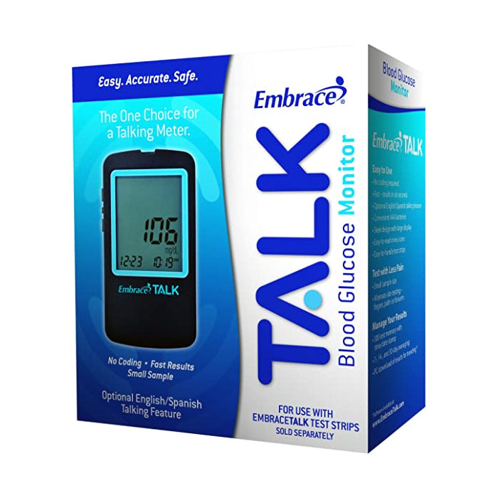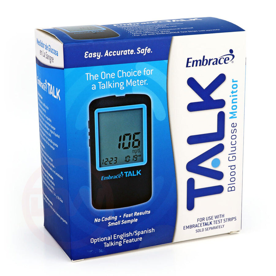 The feature-rich no coding Embrace TALK Glucose Meter offers quick, accurate results using a tiny blood sample, and with the talking feature you have the option to hear your results as well as see them.