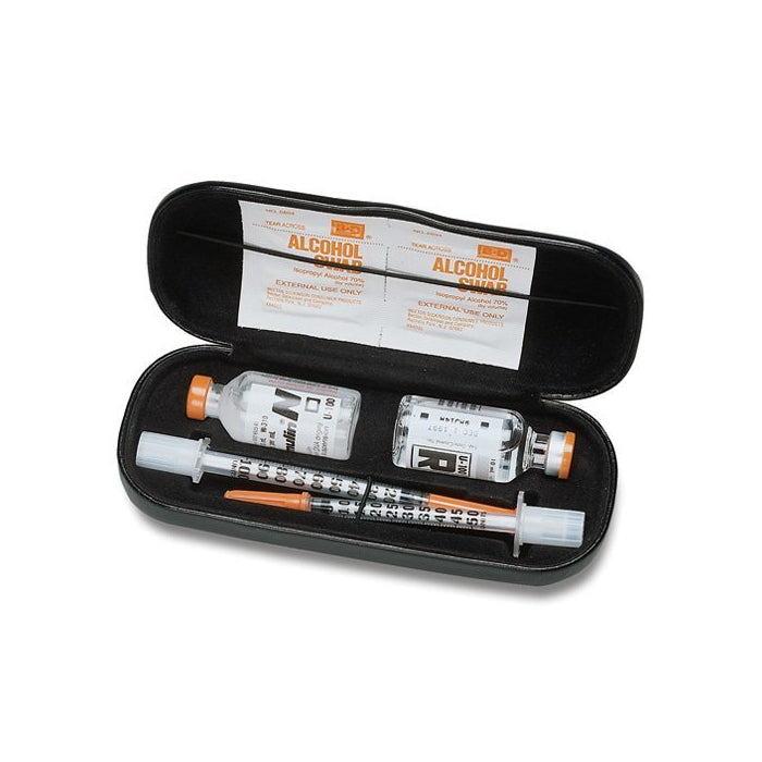 Simulating a designer eyeglass case, the DI Case insulin travel case is made of lightweight aluminum with a fitted insert that holds two vials of insulin, two syringes, and also, alcohol swabs. This compact carrying case weighs only 4 ounces and fits comfortably in your purse or pocket.