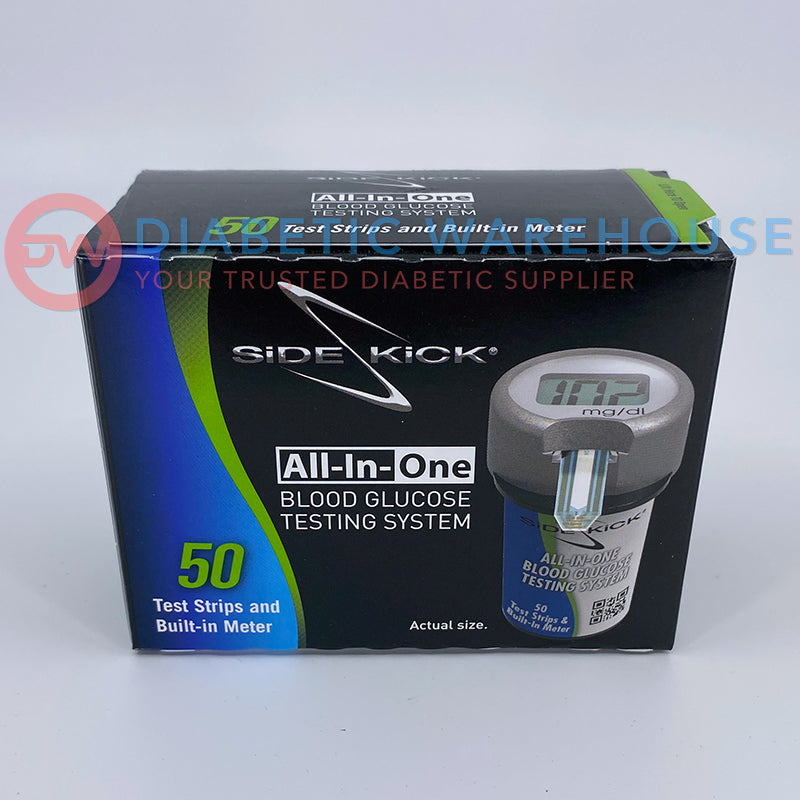 Sidekick is an all-in-one disposable blood glucose testing system: 50 test strips with a built-in meter for the ultimate convenience. Take it wherever you go to better manage your diabetes.