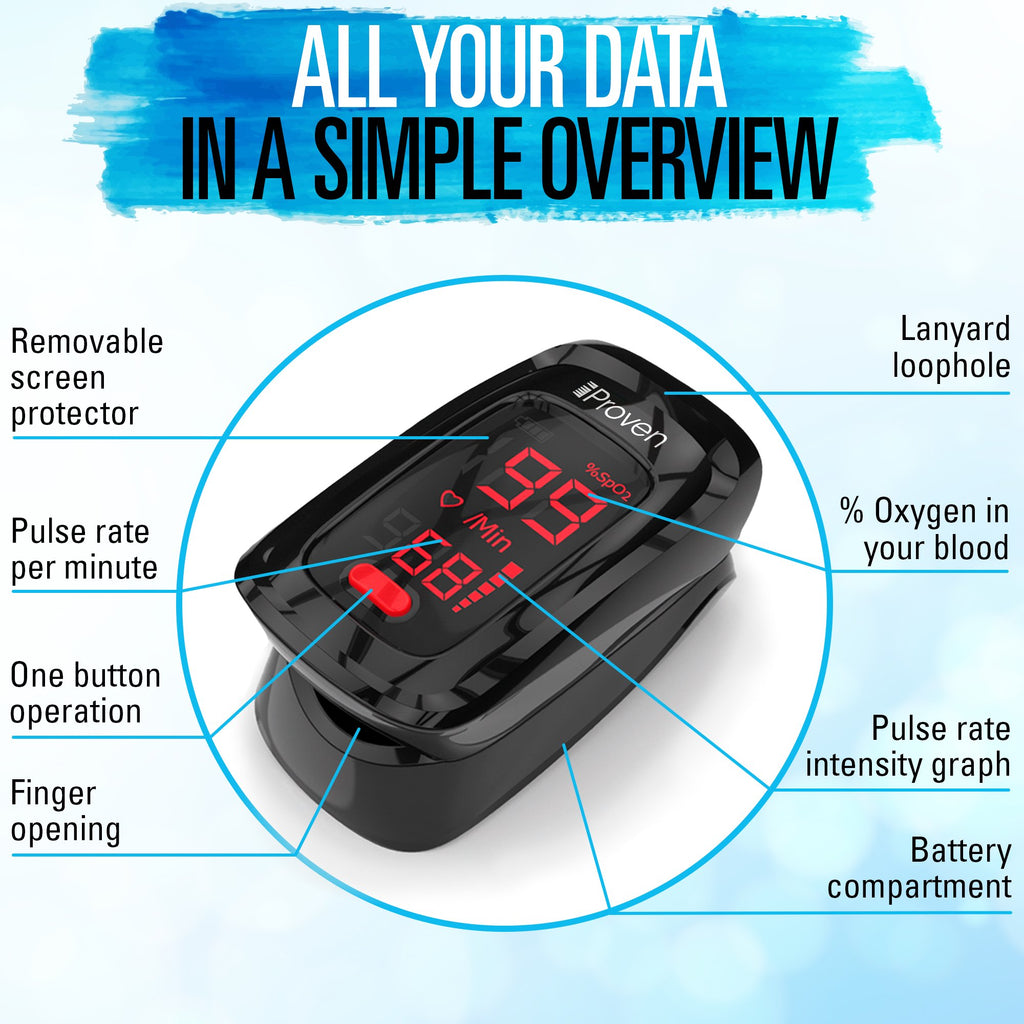 Track your health with iProven's all-in-one Oxygen Monitor. The device is precision-engineered to continuously measure your SpO2, pulse rate, and pulse intensity. This oximeter is the perfect accessory for every sport and aviation enthusiast.