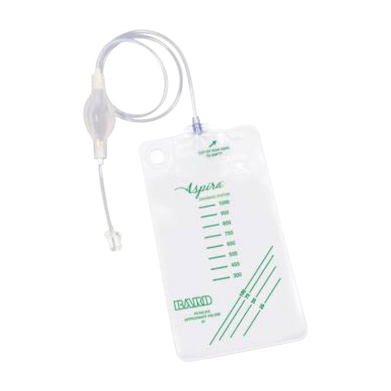 The Bard Aspira Pleural 1000mL Lightweight Drainage Bag accesses the Aspira drainage catheter to drain any accumulated fluid in the pleural (chest) or peritoneal (abdomen) cavity to relieve symptoms associated with pleural effusions or malignant ascite.