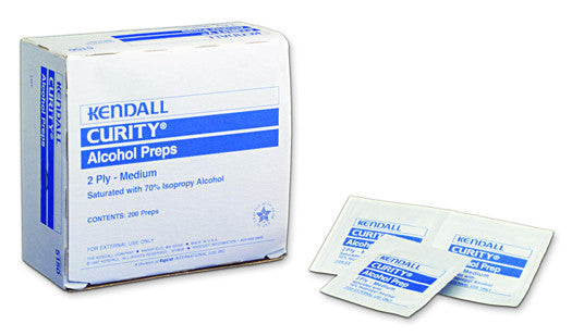 The Kendall 5150 Curity Alcohol Prep Pads are a single-use, medium 2-ply pad for skin preparation. These pads are saturated with 70% isopropyl alcohol to help reduce bacteria counts of the skin prior to injection. These Kendall alcohol pads are made with a non-woven sponge which are individually wrapped in foil sealed package to prevent any dryness. 200 pads per box.