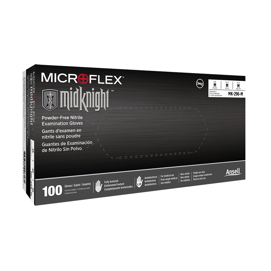 MICROFLEX MidKnight MK-296 black nitrile exam gloves present tough protection while concealing dirt, oils, and grease so the users’ hands appear tidy and professional in the workplace. These durable dark color nitrile gloves allow workers to easily see lighter materials they manage. Ansell’s disposable grip gloves are also fully textured and non-foaming, so you may grip tools and materials confidently even when wet.