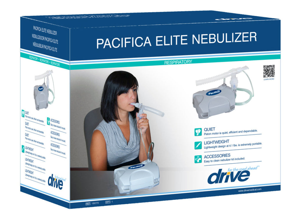 The Drive Pacifica Elite Compressor Nebulizer is a workhorse that provides a source of compressed air for home health care use with higher liter flows, shorter treatment times and quieter operation than similar economy compressor nebulizers. The very compact design makes it extremely portable. The powerful piston pump of the Pacifica Elite Nebulizer is efficient, dependable and quiet. It delivers a consistent particle size of <5 microns plus fast treatment times. This compressor nebulizer converts certain inhalable drugs into an aerosol form for inhalation by the patient.