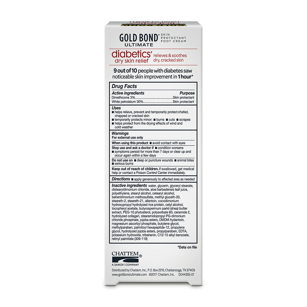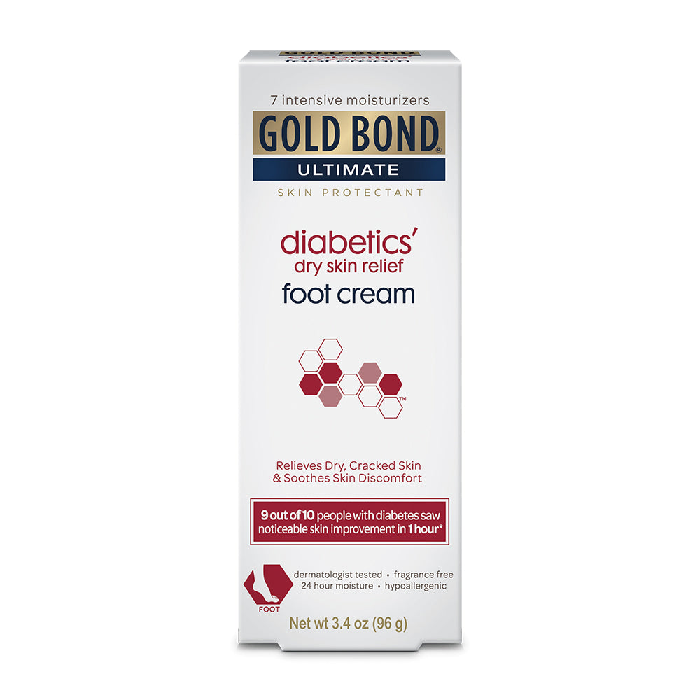 Hydrate dry, flaky, rough diabetic skin. Gold Bond’s Ultimate Diabetics Dry Skin Relief Foot Cream offers immediate soothing and hydration that lasts the entire day. The foot cream is designed to smooth out any rough patches and penetrate 10 surface layers deep into your skin. 9 out of 10 diabetics saw a noticeable improvement on their skin within just 1 hour.