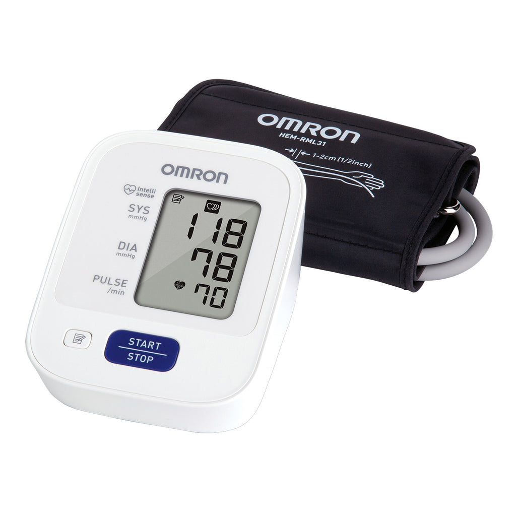 The OMRON 3 Series Upper Arm home blood pressure monitor is designed for accuracy and stores 14 blood pressure readings for one user, and includes a wide-range D-ring cuff (fits arms 9” to 17” in circumference).