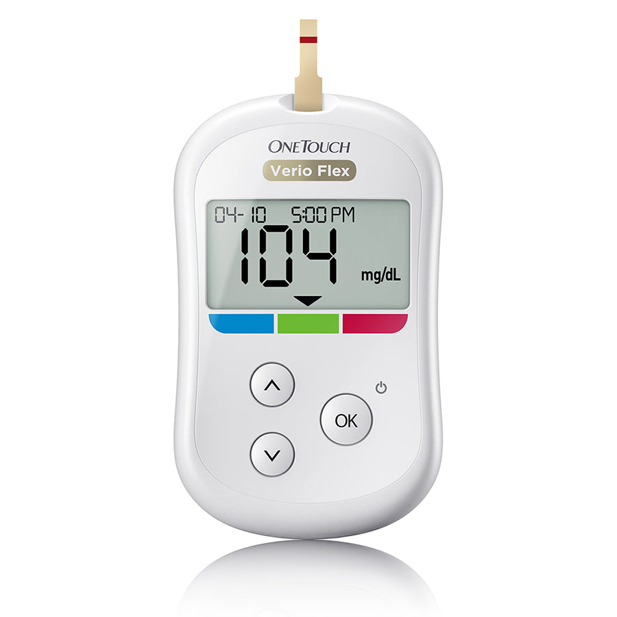 The OneTouch Verio Flex Meter is a blood glucose monitoring device designed to help people with diabetes manage their blood sugar levels. It offers an easy-to-read color-coded range indicator and Bluetooth connectivity for seamless data transfer to the OneTouch Reveal mobile app.